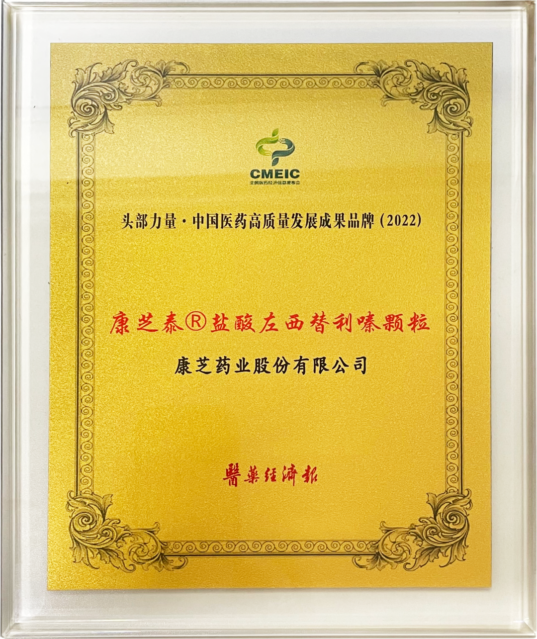 康芝泰?盐酸左西替利嗪颗粒获得“头部力量中国医药高质量发展成果品牌”奖项
