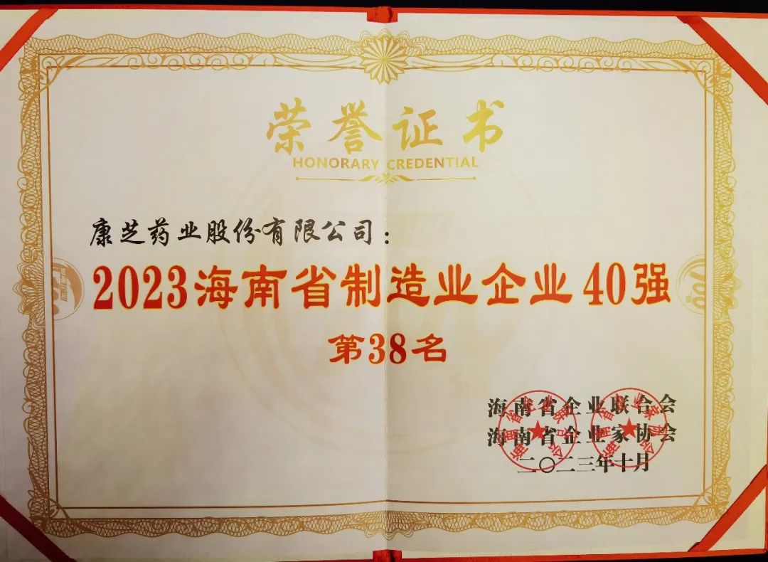 “2023海南省制造企业40强榜”是由海企联、海企协在中国企业联合会、中国企业家协会的指导下,在省政府有关主管部门的大力支持下,经相关部门推荐,在海南省企业自愿申报的基础上,参照国际上通行的做法,以2022年企业营业收入为入围标准进行排序。本年度成功入选该榜单象征着社会各界对康芝药业的高度认可。