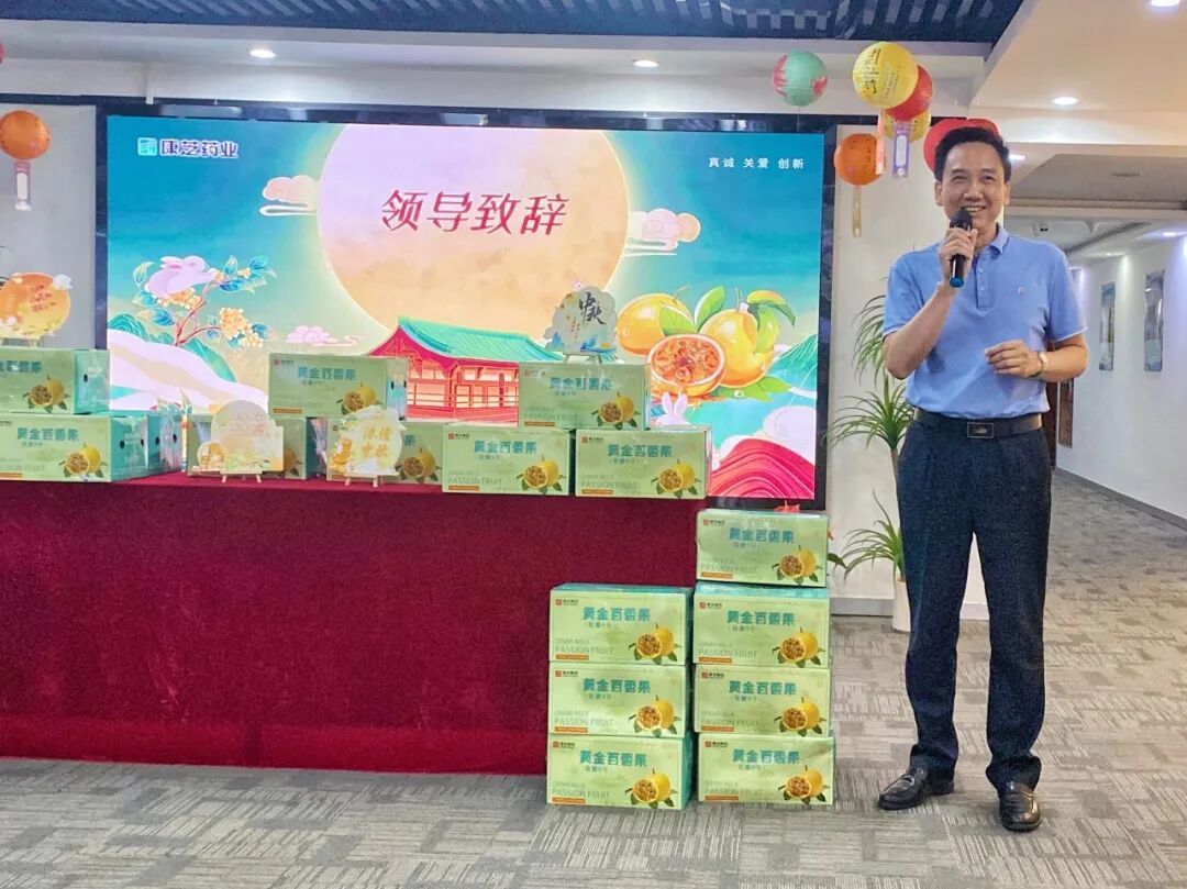 广州区域活动现场暖意融融,精巧的灯笼装饰和主画面相映成趣。康芝药业总裁洪江涛先生首先代表公司向全体同仁致以诚挚的节日问候,并为员工一一派发了中秋礼品。