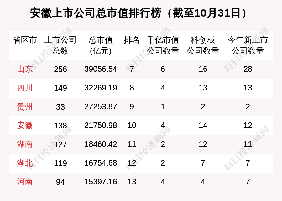 据统计,与贵州相比,安徽上市公司总数比贵州多105家;千亿市值公司数量比贵州多3家;科创板公司数量比贵州多12家;今年新上市公司数量比贵州多10家。
