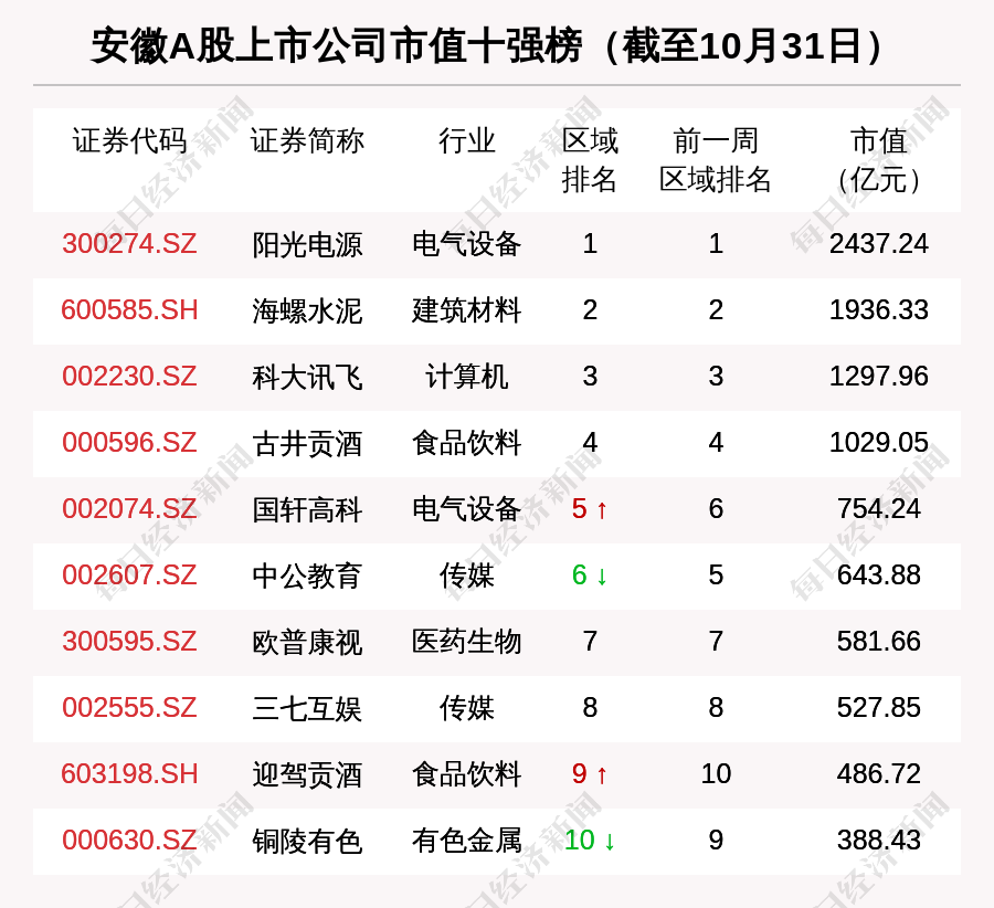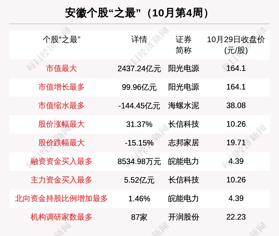 截至10月31日,安徽板块市值最大的是阳光电源,市值最小的是文一科技。上周市值增长最多的是阳光电源,增长99.96亿元;市值缩水最多的是海螺水泥,缩水144.45亿元。