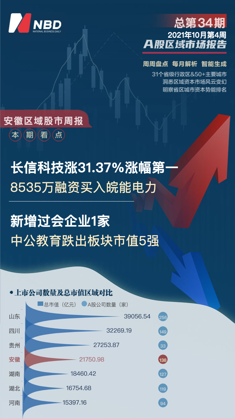 涨跌幅方面,截至2021年10月31日,安徽板块市值与前一周相比,区间涨幅为1.36%(加权平均值),涨幅排名全国第4位。