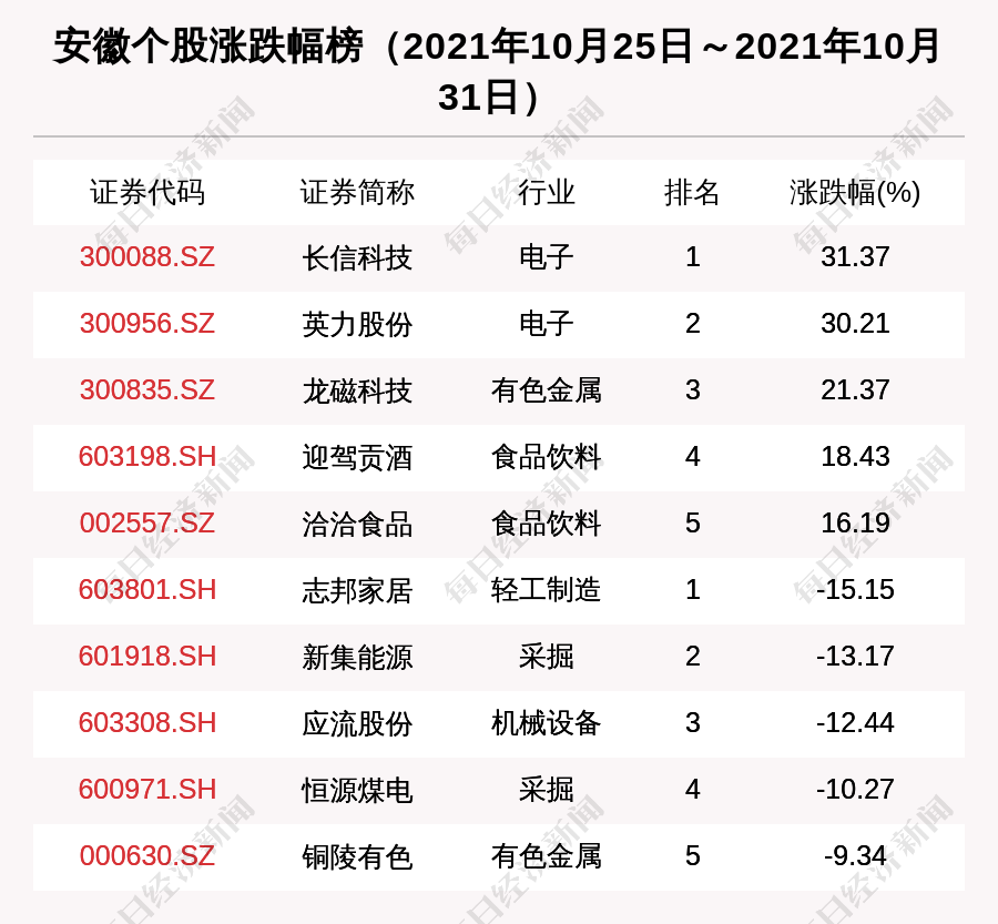 从涨跌幅来看,上周涨幅最大的安徽公司是长信科技,上涨幅度为31.37%。跌幅最大的是志邦家居,下跌幅度为15.15%。