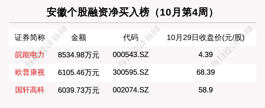 先看融资资金,10月第4周,安徽板块融资净偿还总额为3.37亿元。融资净买入最多的安徽股是皖能电力,金额是8534.98万元。其次是欧普康视(6105.46万元)和国轩高科(6039.73万元)。