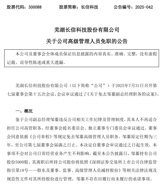7月31日晚间,芜湖长信科技股份有限公司(以下简称“长信科技”,300088.SZ)发布《关于公司高级管理人员免职的公告》。公告显示,公司副总经理邹蓁违反公司相关工作纪律及管理制度,公司认为其不再适合担任公司高管职务,经董事会提名委员会、独立董事专门委员会审议通过,董事会同意依据《公司章程》等规定免去邹蓁高级管理人员职务。