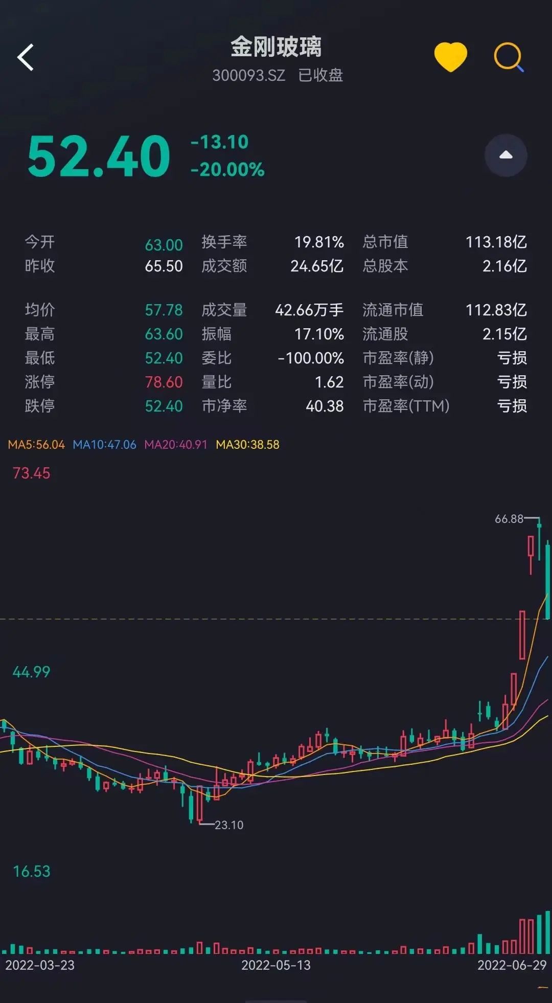 大盘表现虽然亮眼,但是金刚玻璃(300093.SZ)的走势,更是亮瞎了风云君钛合金狗眼。