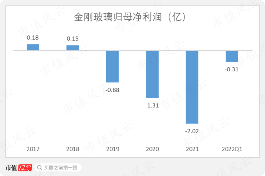 2019年-2021年,金刚玻璃的归母净利润已经连续三年为负,且亏损金额呈现稳定扩大趋势。2021年,公司全年亏损2.02亿,2022年一季度仍然亏损0.31亿。