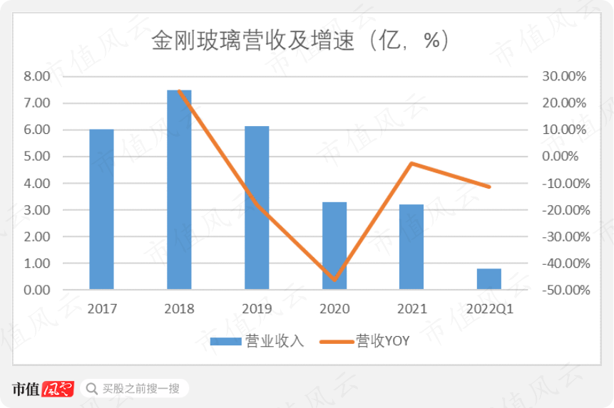 2018年以来,金刚玻璃的营收便一路下滑,2021年公司仅实现营收3.21亿,不足2018年营收的一半。