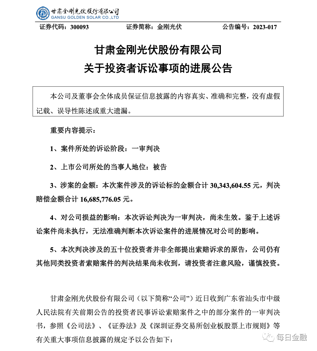 金刚光伏3月24日公告,公司近日收到广东省汕头市中级人民法院有关前期公告的投资者民事诉讼索赔案件之中的部分案件的一审判决书。判决如下:公司应于判决生效之日起十五日内赔偿各原告损失合计1668.58万元;驳回原告的其他诉讼请求。上述诉讼判决为一审判决,尚未生效。鉴于上述诉讼案件尚未执行,无法准确判断本次诉讼案件的进展情况对公司的影响。