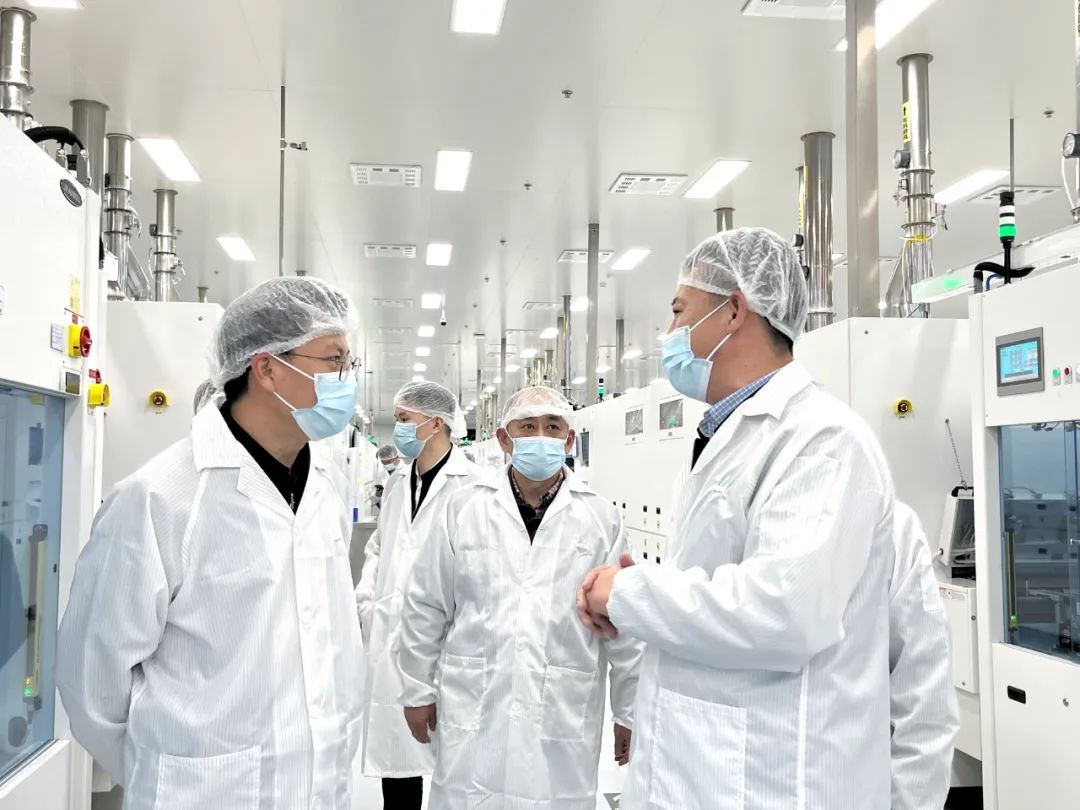 陈为一行首先参观了金刚光伏异质结电池智能生产车间,通过详细了解异质结电池的核心技术攻关、转化效率、全生命周期成本等情况,实地感受金刚光伏多维度持续创新背后的研发实力与产能优势,陈为一行对金刚光伏太阳能电池产品表示出浓厚兴趣,并对金刚光伏转型以来取得的成就给予高度评价。