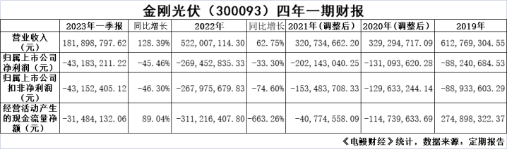 2019年、2020年、2021年、2022年和2023年一季度,金刚光伏分别实现营业收入6.13亿元、3.30亿元、3.21亿元、5.22亿元和1.82亿元,分别实现净利润-8824.07万元、-1.31亿元、-2.02亿元、-2.69亿元和-4318.32万元。