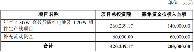 根据发行预案,金刚光伏本次拟募集资金总额为不超过20亿元,发行股份不超过发行前公司总股本的30%,即不超过6480万股,其中14亿元投向年产4.8GW高效异质结电池及1.2GW组件生产线项目,6亿元用于补充流动资金。