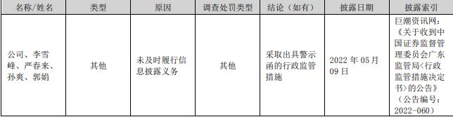 年报显示,公司于2022年5月7日收到广东监管局下发的《证监会广东监管局行政监管措施决定书》(〔2022〕53 号),公司及子公司苏州金刚防火钢型材系统有限公司2021年度合计向合惠(天津)商业保理有限公司融资1亿元、向新余澎湃资产管理有限公司融资1.3亿元,金额合计2.3亿元,占公司披露的上一年度总资产的23.23%,构成上市公司应进行临时报告的重大事项。公司未及时履行信息披露义务,董事长李雪峰、总经理严春来、财务负责人孙爽、董事会秘书郭娟未能按照《上市公司信息披露管理办法》第四条的规定履行勤勉尽责义务,对上述违规行为负有主要责任。证监会决定对公司、李雪峰、严春来、孙爽、郭娟采取出具警示函的行政监管措施。
