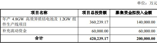 公司本次向特定对象发行股票募集资金总额为不超过200000.00万元(含本数),扣除发行费用后的募集资金净额拟用于年产4.8GW高效异质结电池及1.2GW组件生产线项目、补充流动资金。