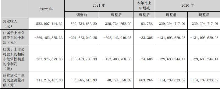 据金刚光伏2022年年报,报告期内,公司实现营业收入5.22亿元,同比增长62.75%;归属于上市公司股东的净利润-2.69亿元,同比减少33.30%;归属于上市公司股东的扣除非经常性损益的净利润-2.68亿元,同比减少74.60%;经营活动产生的现金流量净额-3.11亿元,同比减少663.26%。