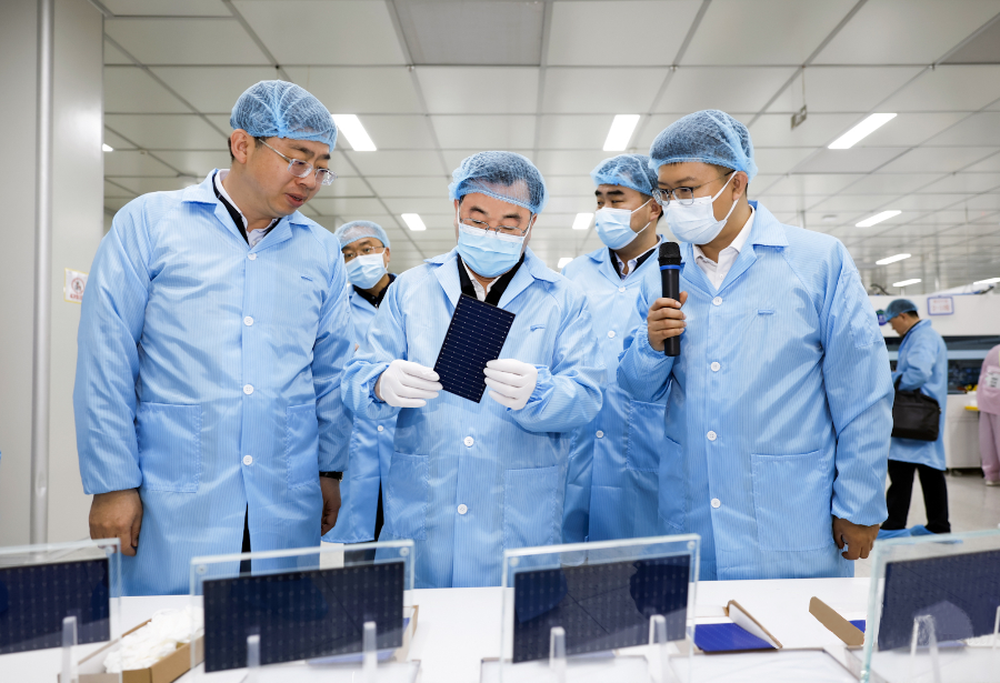 胡昌升在公司副总经理蒋万昌的陪同下实地参观考察了酒泉工厂异质结电池智能生产车间,认真听取了关于金刚光伏酒泉工厂产线运营情况汇报,当了解到项目作为光伏行业第一个GW级210半片双面微晶异质结电池生产基地,已进入常态化运营阶段,且产线电池片转换效率位于行业前沿,胡昌升对金刚光伏酒泉工厂异质结电池智能生产车间的运营情况给予了高度肯定,并表示将坚定支持金刚光伏在酒泉及甘肃省的产业发展和项目运营。同时,胡昌升要求金刚光伏要以科技创新为引擎,坚持自主研发,持续聚焦主业,把牢主攻点,不断做精产品,在光伏领域打造拳头产品,赋能光伏能源的应用与推广,勇当行业龙头,助力国家“蓝天保卫战计划”的战略落地。