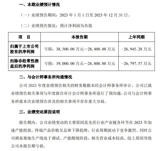 “报告期内,公司业绩变动的主要原因是光伏行业产业链各环节在2023年加速产能投放,终端产品价格呈总体下降趋势,行业周期波动下竞争激烈。同时公司酒泉基地生产线处于调试、产能爬坡阶段,相关营业成本较高。综上原因导致公司本报告期亏损。”公司在2023年业绩预告中解释称。