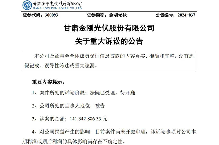 5月28日晚,金刚光伏发布公告,2024年5月27日,公司下属子公司苏州金刚光伏科技有限公司(简称“苏州金刚”)因融资租赁合同纠纷案收到上海金融法院送达的《应诉通知书》,涉案的金额1.41亿元。