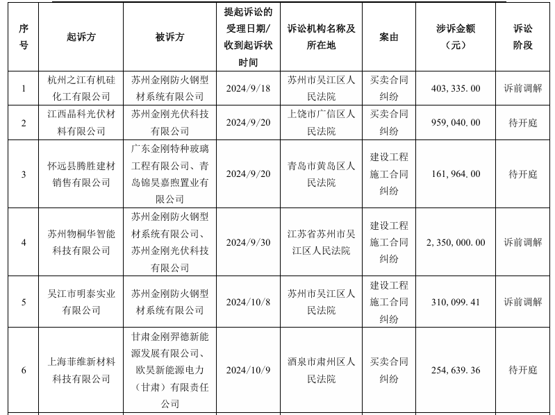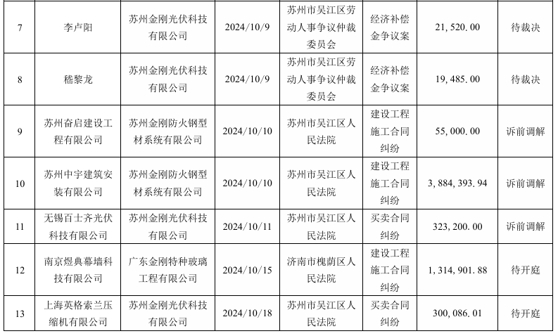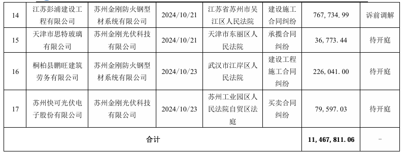 10月25日,金刚光伏发布公告称,截至本公告披露日,公司及控股子公司新增诉讼、仲裁金额累计为人民币 11,467,811.06 元(不含以及前期已履行披露义务的案件金额)。具体情况如下:
