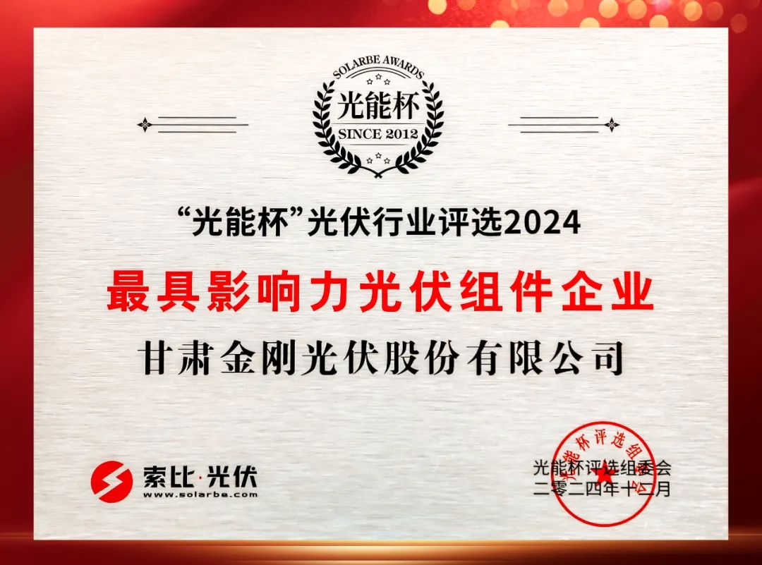 2024年12月26日,由索比·光伏主办的2024年度第十二届“光能杯”光伏行业颁奖盛典在苏州圆满举办。金刚光伏凭借其在光伏领域的卓越表现和产品实力,获得“2024最具影响力光伏组件企业”奖,品牌声量再度飙升。