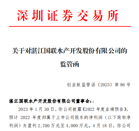 深交所调查发现,今年1月30日,国联水产披露《2022年度业绩预告》,预计2022年度归属于上市公司股东的净利润(下称“净利润”)盈利2700-4000万元;4月18日,公司披露《2022年度业绩预告修正公告》,预计2022年度净利润为亏损500-1000万元;4月29日,公司披露2022年报显示,2022年度经审计的净利润为亏损757.68万元。