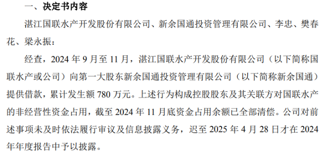 另外,广东证监局于今年11月向 国联水产 、新余国通及相关上市公司高管出具的《行政监管措施决定书》显示,2024年9月至11月, 国联水产 向新余国通提供借款,累计发生额780万元。该行为构成控股股东及其关联方对 国联水产 的非经营性资金占用,而上市公司迟至今年4月28日才在年报中予以披露。