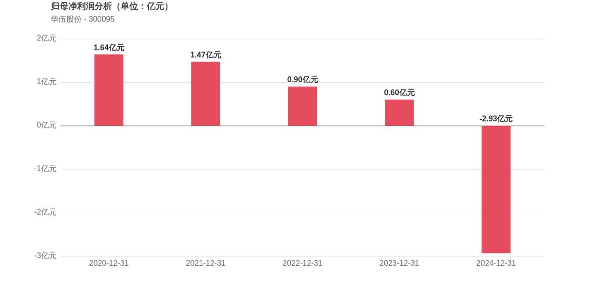 利润角度分析,2020年华伍股份实现归母净利润1.64亿元,2024年-2.93亿元。公司盈利能力持续恶化,2024年归母净利润同比下降585.32%,由盈转亏。