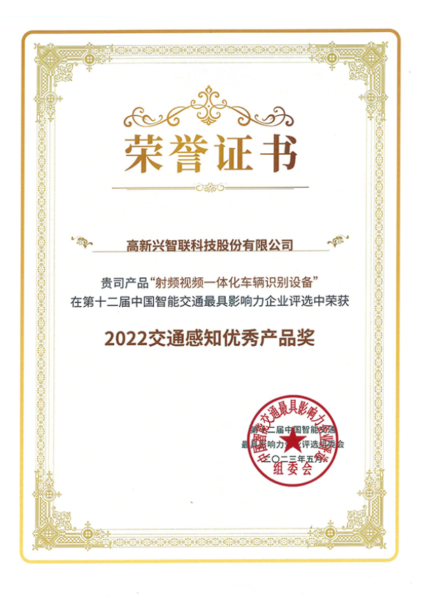 图/高新兴荣获“2022交通感知优秀产品奖”