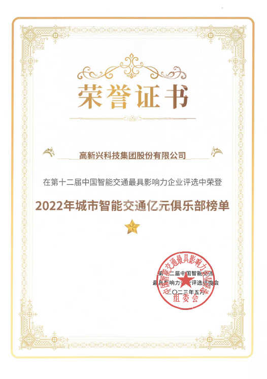 图/高新兴荣获“2022年中国智能交通市场亿元俱乐部榜单”