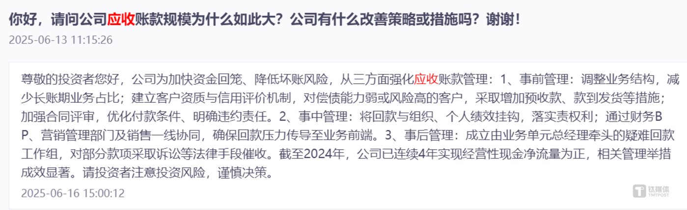 “排雷”完毕后,如今的财务报表仍难掩隐忧。由于客户群体属性原因,导致公司应收账款居高不下。数据显示,近三年公司应收账款分别为16.63亿元、15.70亿元、14.88亿元。有投资者在互动平台追问,为何公司应收账款规模如此庞大,未来有何改进措施?但公司的回复,依然是那份投资者耳熟能详的“标准答案”。