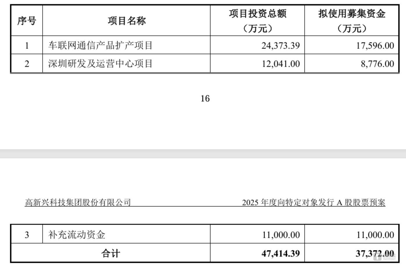 高新兴《2025年度向特定对象发行A股股票预案》显示,公司拟向特定对象发行股票,募集资金不超过3.74亿元,其中,1.76亿元用于“车联网通信产品扩产项目”,8776万元用于“深圳研发及运营中心项目”,1.1亿元用于补充流动资金。