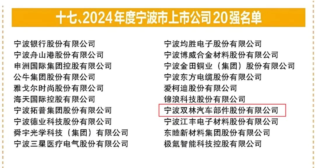 此次荣登“宁波上市公司20强”,是对双林股份过往发展路径的充分肯定,也为公司未来发展注入了强劲动力。未来,双林股份将继续秉持创新驱动发展理念,紧密围绕国家产业政策导向,深耕智能制造核心技术,持续优化产业布局,为区域经济高质量发展贡献更多力量。