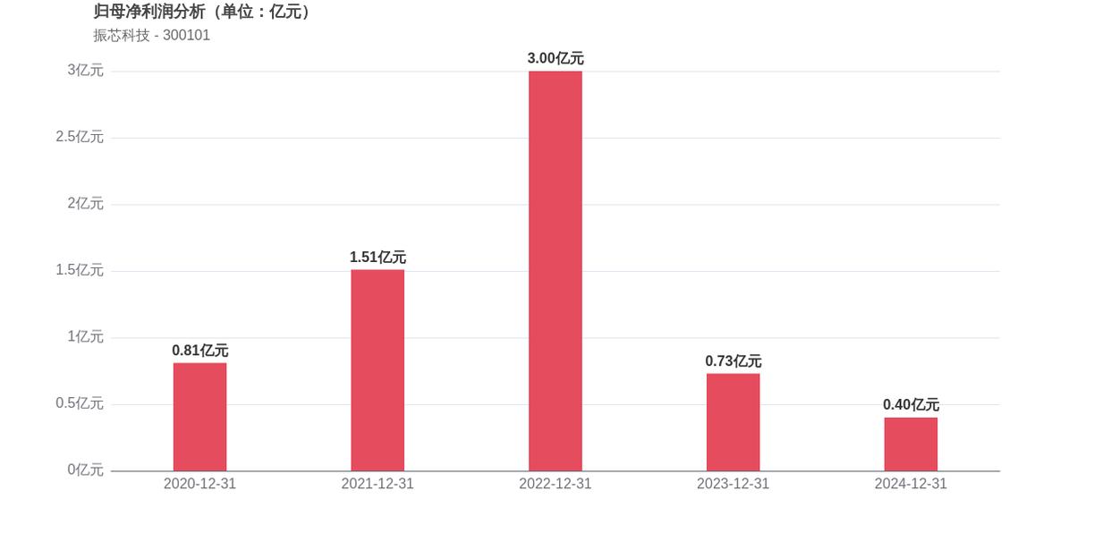利润角度分析,2020年振芯科技实现归母净利润0.81亿元,2024年0.40亿元。公司归母净利润在2020年至2022年实现高速增长,但2023年和2024年大幅下滑。