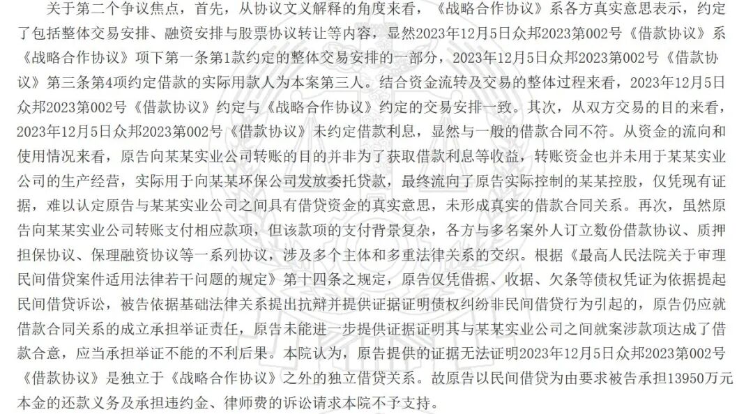 西安市雁塔区人民法院 认定,2023年12月5日签订的《借款协议》即为《战略合作协议》项下第一条第1款第(2)项约定的借款协议。原告孙建西提供的证据无法证明该《借款协议》是独立于《战略合作协议》之外的独立借贷关系。故原告孙建西以民间借贷为由要求被告承担1.395亿元本金的还款义务及承担违约金、律师费的诉讼请求本院不予支持。
