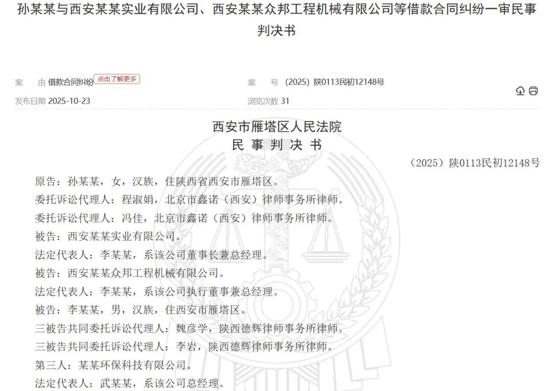 2025年10月23日,中国裁判文书网刊登的《孙某某与西安某某实业有限公司、西安某某众邦工程机械有限公司等借款合同纠纷一审民事判决书》【案号:(2025)陕0113民初12148号】,披露了孙建西和 西安中旺众邦工程机械 公司因股权转让未果产生的纠纷始末。