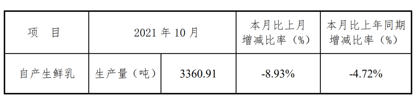 数据显示,西部牧业2021年10月自产生鲜乳生产量为3360.91吨,较上月减少8.93%,较上年同期减少4.72%。