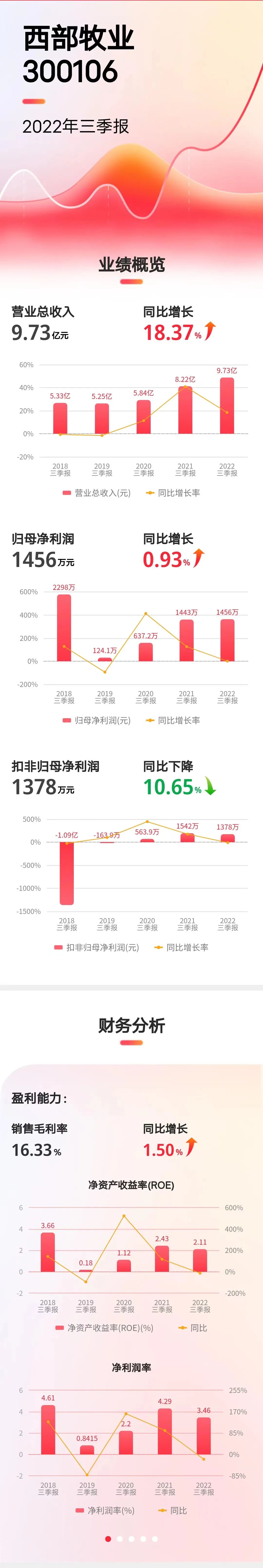 10月24日,西部牧业(300106)发布公告,前三季度实现营收9.73亿元,同比增长18.37%;实现归母净利润1456.2万元,同比增长0.93%,实现扣非净利润1378万,同比下滑10.65%。