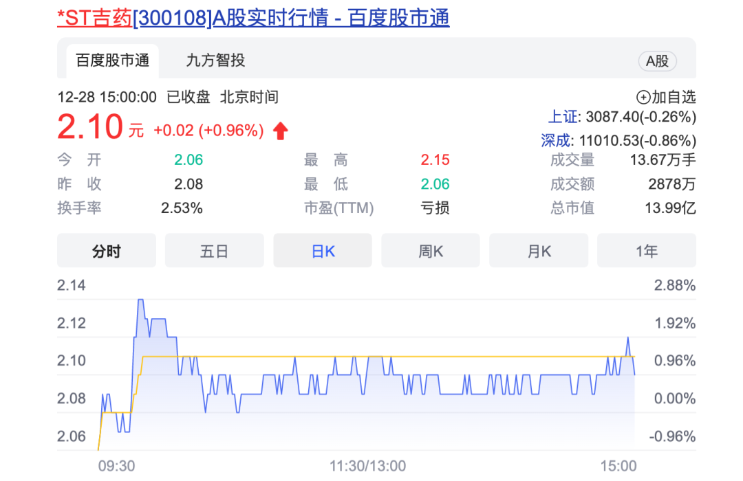 截至12月28日A股收盘,*ST吉药股价为2.10元/股,总市值为13.99亿元。