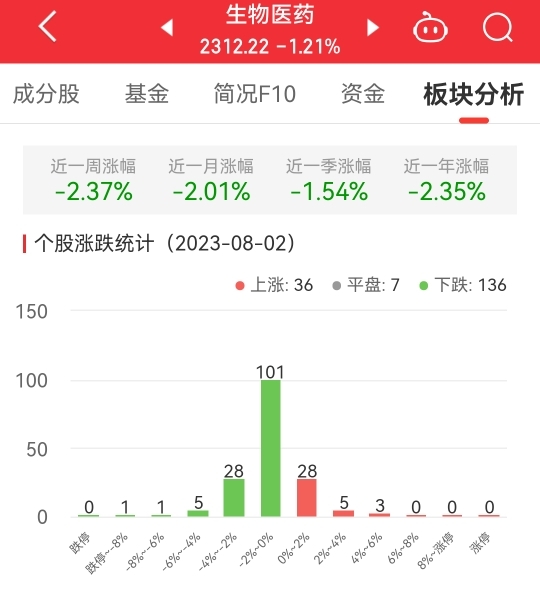 今日,生物医药板块整体跌幅1.21%,其中36只股票上涨,7只股票平盘,136只股票下跌。