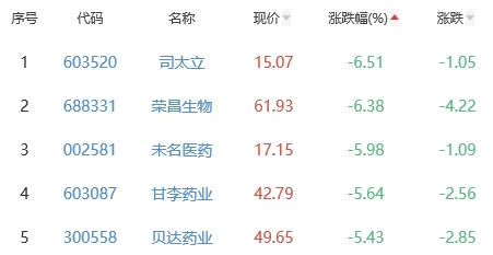 司太立、荣昌生物、未名医药、甘李药业、贝达药业位列涨幅榜后五位,涨幅分别为-6.51%、-6.38%、-5.98%、-5.64%、-5.43%。