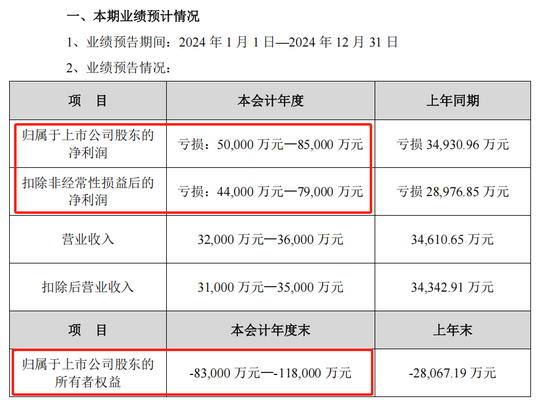 财务数据显示,2020年至2023年公司营收从6.49亿元缩水至3.46亿元,同期归母净利润均为亏损。根据2024年业绩预告,公司预计亏损5亿元至8.5亿元。由此来看,公司自2019年起,已连续6年亏损,累计亏损近40亿元。