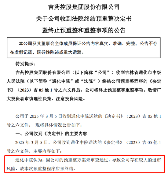 2023年7月,*ST吉药以公司不能按时清偿到期债务且明显缺乏清偿能力,但具有破产重整价值为由,向法院申请对公司进行破产重整,并申请启动预重整程序。今年3月,因方案未获通过,法院终止公司预重整程序,这也意味着*ST吉药失去通过债务重组恢复经营的机会。