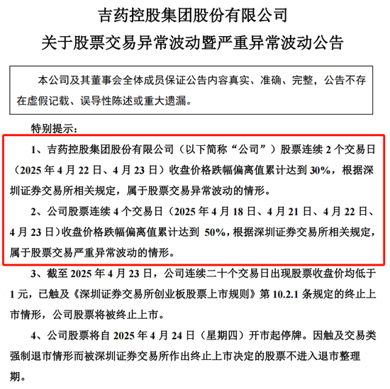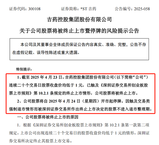4月24日,*ST吉药(维权)(300108)发布公告称,截至当日,公司已连续20个交易日股票收盘价均低于1元,触及深交所交易类强制退市情形,公司股票将被终止上市,自4月24日(星期四)开市起停牌。
