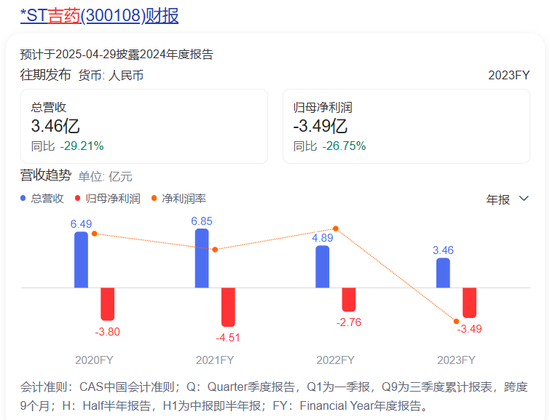 今年1月,*ST吉药发布业绩预亏公告时特别作出提示,公司预计亏损5亿至8.5亿元,期末净资产为-8.3亿至-11.8亿元(未经审计)。根据《深圳证券交易所创业板股票上市规则》的规定,如果公司2024年度期末经审计净资产为负值,公司将触发财务类强制退市指标,公司股票将被终止上市。