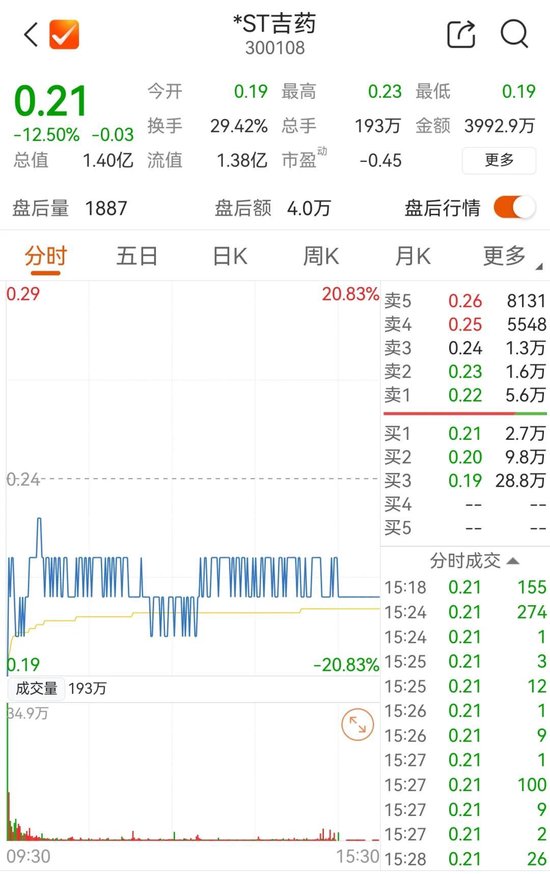 上市15年,*ST吉药在A股市场最后一个交易日的股价定格在0.21元,市值1.4亿元。