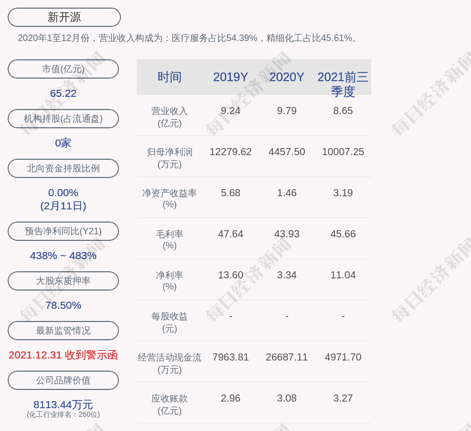 2020年1至12月份,新开源的营业收入构成为:医疗服务占比54.39%,精细化工占比45.61%。