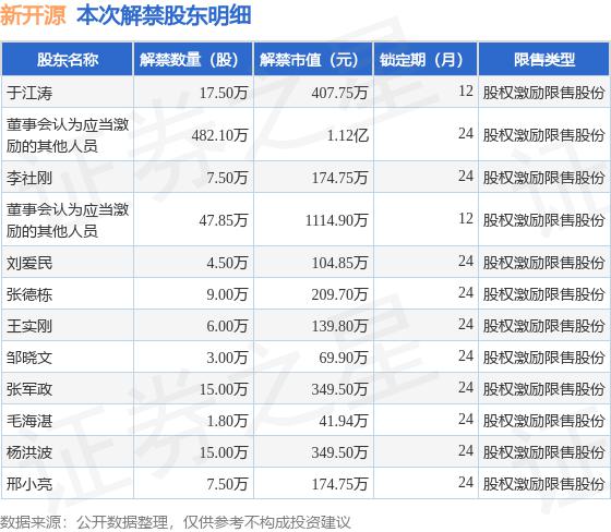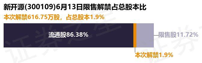 根据市场公开信息整理,新开源(300109)于 6 月 13 日将有 616.75 万股限售股份解禁上市,为公司股权激励限售股份,占公司总股本 1.9%。最近一年内,该股累计解禁 817.6 万股,占总股本的 2.52%。本次解禁后,公司还有 3795.54 万股限售股份,占总股本 11.72%。具体如下图所示: