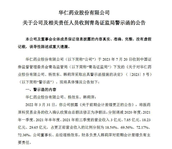近日,华仁药业发布公告,公司于2023年7月20日收到中国证券监督管理委员会青岛监管局(以下简称“青岛证监局”)下发的《关于对华仁药业股份有限公司、杨效东、韩莉萍采取出具警示函措施的决定》。