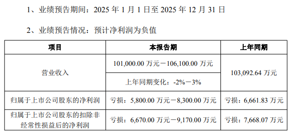 1月30日,万讯自控(300112)披露2025年度业绩预告,预计2025年实现营业收入10.1亿元至10.61亿元,同比变动-2%至3%;归母净利润亏损5800万元至8300万元,上年同期亏损6661.83万元;扣非净利润亏损6670万元至9170万元,上年同期亏损7668.07万元。