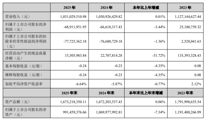 4月21日,万讯自控(300112)披露2025年年度报告。2025年公司实现营业总收入10.31亿元,同比增长0.01%;归母净利润亏损6891.2万元,上年同期亏损6661.83万元;扣非净利润亏损7772.54万元,上年同期亏损7668.07万元;基本每股收益为-0.24元。